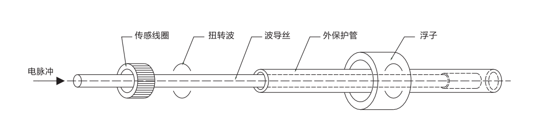 韋德曼效應原理:脈沖發(fā)生器產生的電脈沖沿外保護管內的波導絲傳遞,根據(jù)電磁場理論,電脈沖同時伴隨一個環(huán)形磁場以光速向前傳遞,當該環(huán)形磁場遇到浮子中永久磁鐵的縱向磁場時,將形成一個螺旋形磁場,它作用于波導絲上并使之扭轉,從而產生超聲扭轉波,該超聲扭轉波返回到傳感線圈(變換器)時轉換成橫向應力,使通過傳感線圈的磁通發(fā)生變化,從而在傳感器線圈兩端產生感應電壓, 這樣可以通過精確測量發(fā)射脈沖和返回扭轉波的時間差來確定浮子的精確位置。