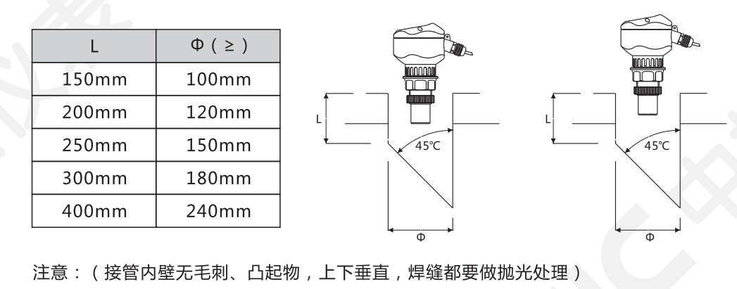 3、探頭伸出短管10mm以上(短管內(nèi)徑較大,可不受此限);