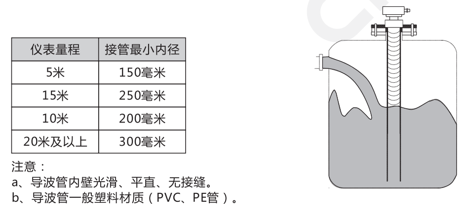 6、導(dǎo)波管:深井等聲束角內(nèi)有障礙物、或者液面波動(dòng)大的場(chǎng)合,可以將傳感器安裝到導(dǎo)波管內(nèi)或者旁通管內(nèi);