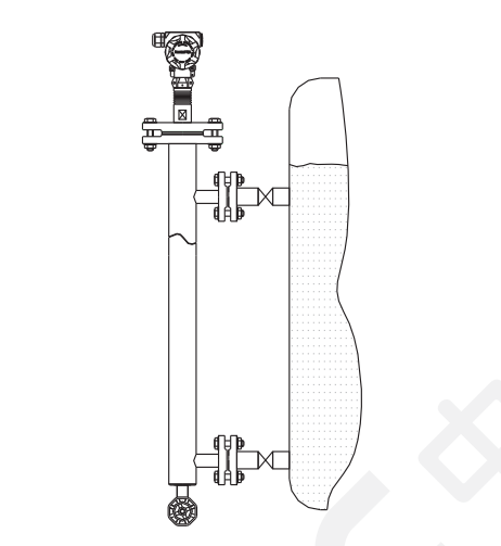 直接安裝 1.大部分使用場合 2.液面波動不劇烈、液面無大量泡沫層 3.纜式、桿式適合 *容器是金屬的,直接利用容器殼體接地(測量地)