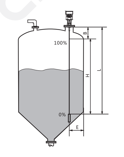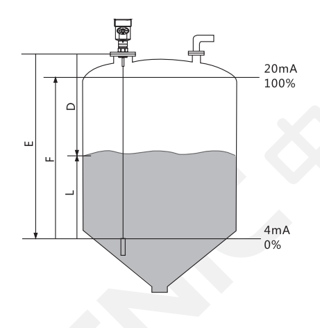 通過輸入空罐高度E(=零點),滿罐高度F(=滿量程)及一些應(yīng)用參數(shù)來設(shè)定,應(yīng)用參數(shù)將自動使儀表適應(yīng)測量環(huán)境,對應(yīng)于4~20mA輸出。